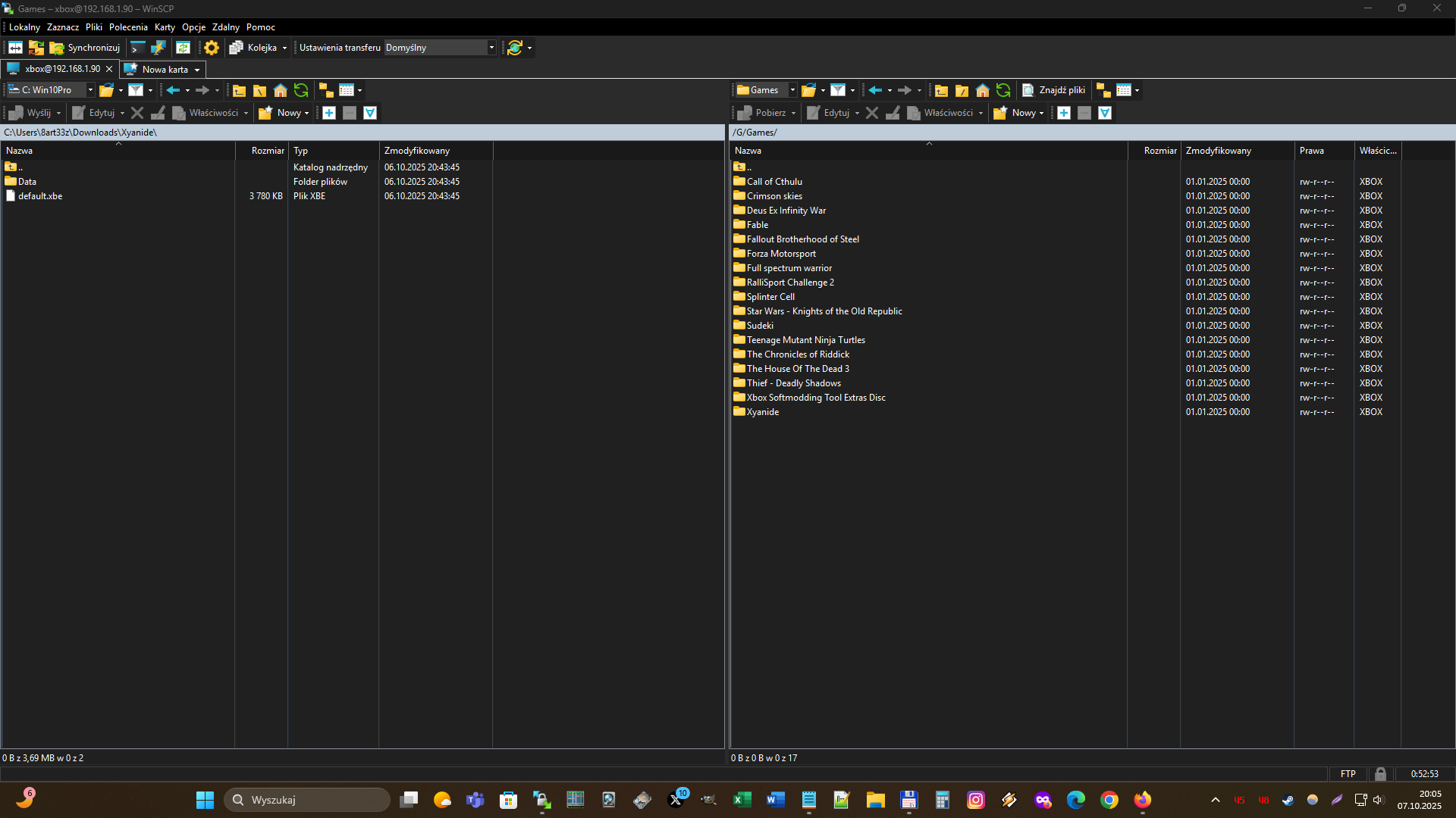 W programie FileZilla wystarczy przeciągnąć folder gry z komputera (lewy panel) do odpowiedniej lokalizacji na dysku Xboxa (prawy panel), np.: G:\Games\Halo Combat Evolved\