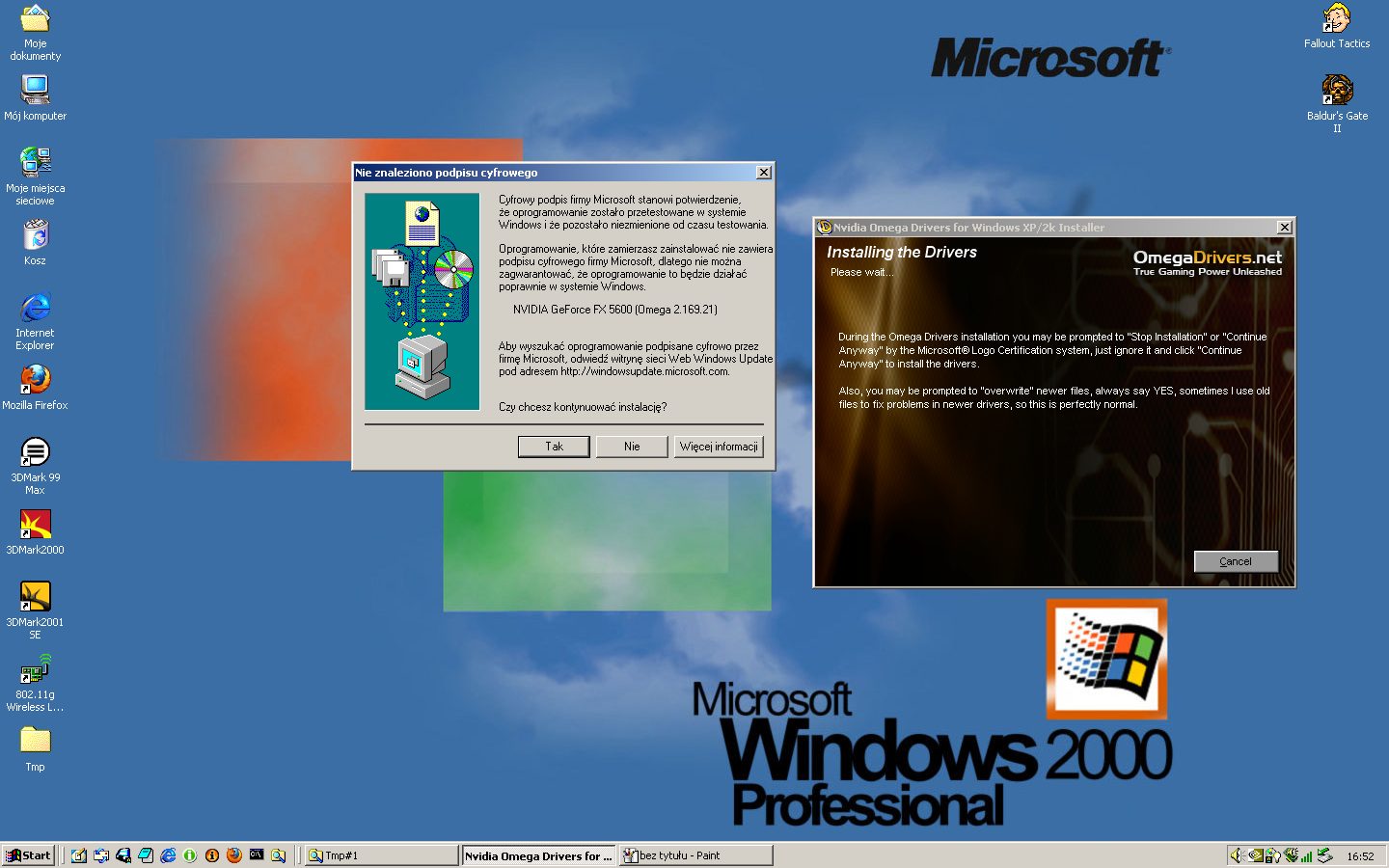 Tak więc przetestowałem paczki instalacyjne NVIDIA Omega Drivers na dwóch różnych buildach: z systemem operacyjnym Microsoft Windows 98 SE, posiadające różne karty graficzne: GeForce 4 Ti4200 i Gainward GeForce FX 5600 Ultra oraz z systemem Windows 2000 (tam także był GeForce FX 5600 Ultra).