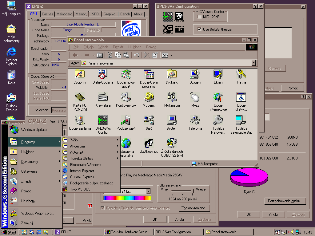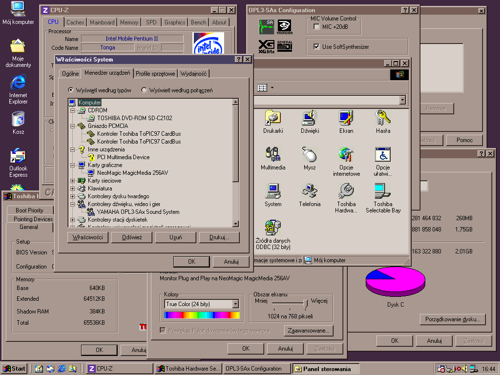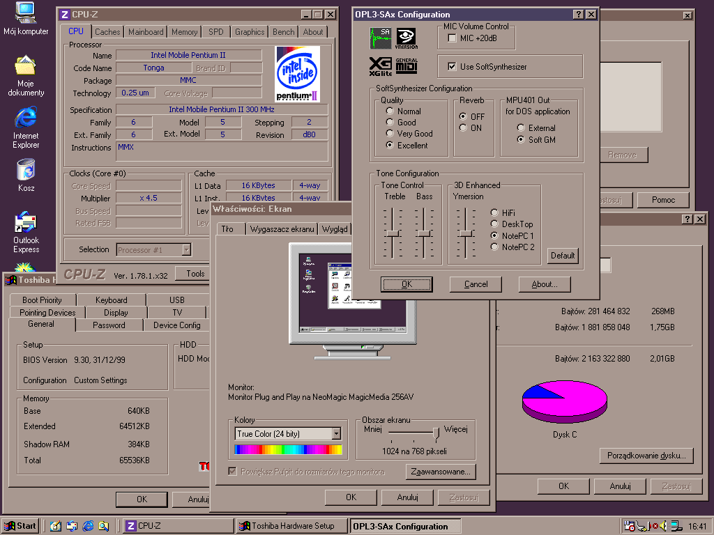 Pewien problem przysporzyło mi odszukanie do Toshiby sterowników, w szczególności do karty grafiki NeoMagic NM2200. Przyznaje, że pierwszy raz widzę taką nazwę / markę, być może to jakiś brandowany chip innej firmy ? Koniec końców udało się wszystko poprawnie zainstalować pod kontrolą systemu operacyjnego Microsoft Windows 98 SE.